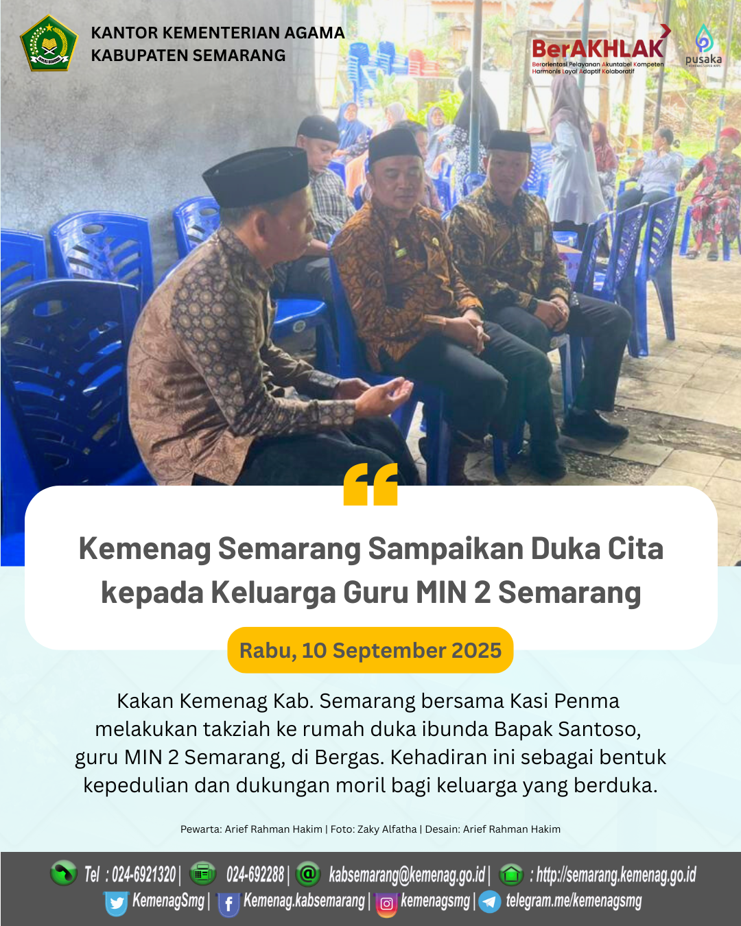 “Atas nama keluarga besar Kemenag Kabupaten Semarang, kami menyampaikan belasungkawa yang sedalam-dalamnya. Semoga almarhumah husnul khatimah, diampuni segala khilafnya, dan keluarga yang ditinggalkan diberi kekuatan serta kesabaran,” ujar Mas Kakan.