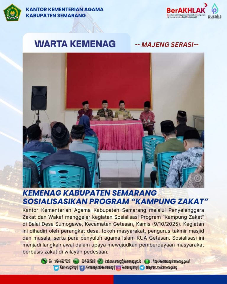 Kantor Kementerian Agama Kabupaten Semarang melalui Penyelenggara Zakat dan Wakaf menggelar kegiatan Sosialisasi Program “Kampung Zakat” di Balai Desa Sumogawe, Kecamatan Getasan, Kamis (9/10/2025). Kegiatan ini dihadiri oleh perangkat desa, tokoh masyarakat, pengurus takmir masjid dan musala, serta para penyuluh agama Islam KUA Getasan. Sosialisasi ini menjadi langkah awal dalam upaya mewujudkan pemberdayaan masyarakat berbasis zakat di wilayah pedesaan.