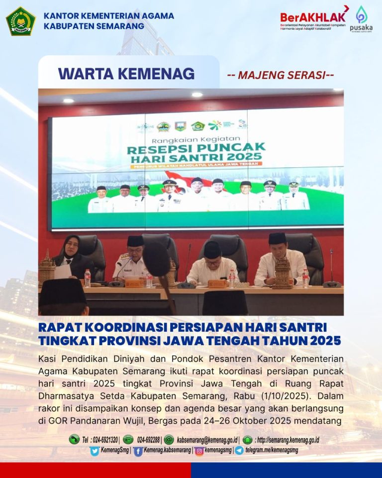 Kasi Pendidikan Diniyah dan Pondok Pesantren Kantor Kementerian Agama Kabupaten Semarang, Hj.Titik Halimah ikuti rapat koordinasi persiapan puncak hari santri 2025 tingkat Provinsi Jawa Tengah di Ruang Rapat Dharmasatya Setda Kabupaten Semarang, Rabu (1/10/2025).