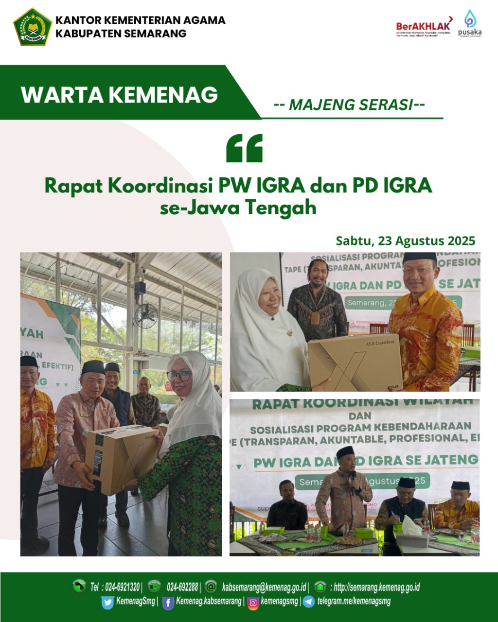 Dihadiri oleh Kepala Bidang Pendidikan Madrasah Kanwil Kementerian Agama Provinsi Jawa Tengah Ahmad Faridi, Kepala Kantor Kementerian Agama Kabupaten Semarang Ta’yinul Biri Bagus Nugroho, Kasi Pendidikan Madrasah Harun Al Rasyid dan Ketua Kelompok Kerja Pengawas Madrasah Abdullah Faqih, kegiatan diselenggarakan di Cimory Bawen, Kabupaten Semarang dengan penuh semangat untuk mewujudkan tata kelola organisasi yang lebih baik. Kehadiran para tokoh tersebut menjadi bentuk dukungan nyata terhadap upaya peningkatan kualitas organisasi IGRA, baik di tingkat wilayah maupun daerah.