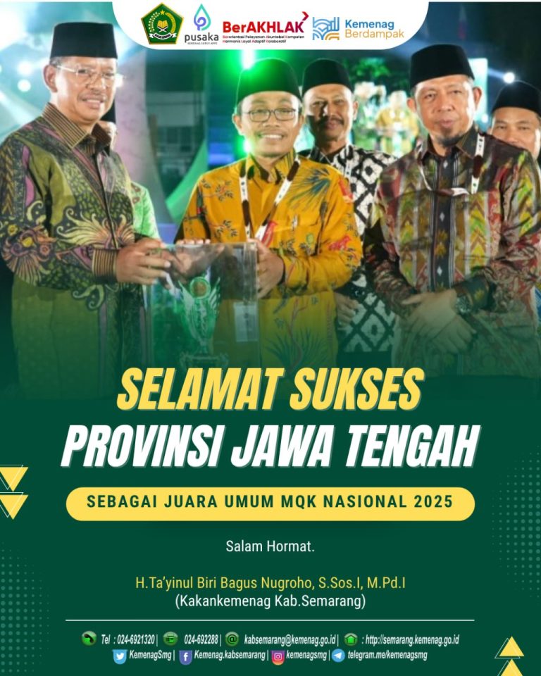 — Selamat dan sukses untuk Provinsi Jawa Tengah, sebagai Juara Umum Musabaqah Qiraatil Kutub (MQK) Nasional 2025.